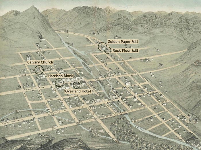 The Overland Hotel, Rock Four Mill, and Golden Paper Mill are gone, but the Harrison Block and Calvary Church are still with us.