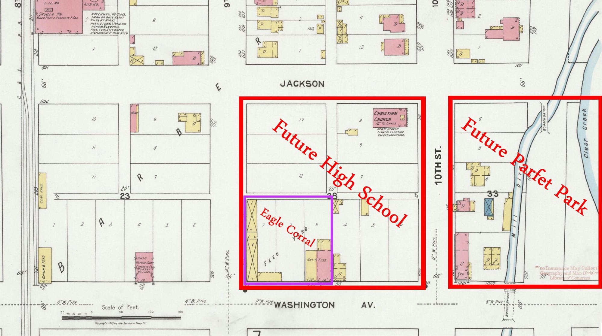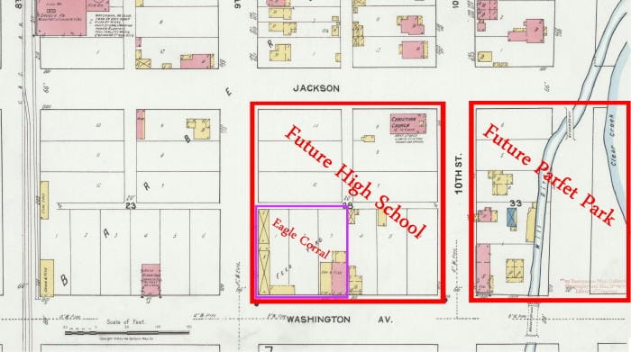 The next argument was whether the school should be on the south side of 10th Street, which people were already earmarking for a future park (it would become Parfet Park), or the north side of 10th Street–the Eagle Corral. A 1922 letter to the editor said the corral “has been an eyesore to the city for years.” Others were more polite, but quietly agreed that a business that involved manure had no place on Golden’s main thoroughfare.