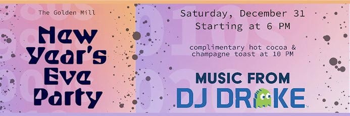 Get your party on early. Dj Drake will be here spinning the music of the decades. We will be watching the ball drop in New York City. There will be complimentary hot chocolate for the kids and champagne for the adults when the ball drops.