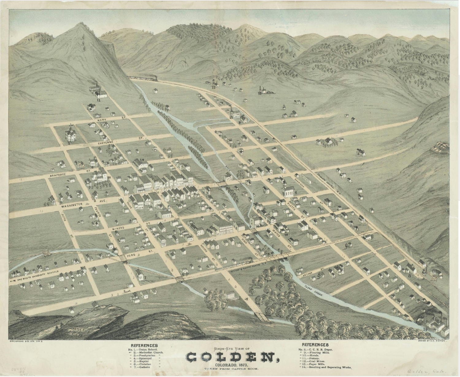 I often use excerpts from the 1882 Birdseye Map of Golden to show buildings from our early days. This one is even earlier–1873! The railroad was here by then, but you’ll notice that the School of Mines isn’t there yet! The large building on the Mines campus is the South School–elementary through grade 12, all in the same building.