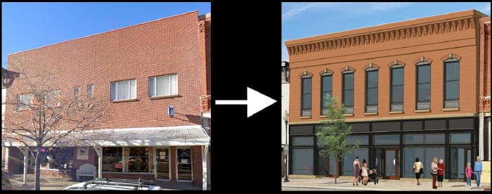 The packet includes a rendering showing the remodeled facade for the former florist shop and antiques store. The plan is to replace for brickwork and bring the building back to its 1872 appearance.