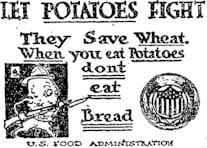 The United States was sending wheat to help feed its allies in Europe. Americans were encouraged to eat wheat sparingly, with Monday and Wednesdays being “wheatless” days, and eating wheat at only one meal a day on the other five days. It was OK to eat potatoes, as illustrated by this ad showing a fighting potato.