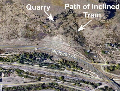 The Denver Tramway Company (DTC) took over operations of the south (aka Tramway) quarry in 1905. One of the difficulties of quarrying 700 feet above the Clear Creek Valley was getting the quarried stone down the hill. After some near-miss disasters with runaway wagons, the DTC installed an inclined tram in 1907 to transport rock more safely and quickly to a crushing facility in Clear Creek Valley, along the DTC 83-line that ran subparallel to 44th St. Worked on-and-off, the quarry was rejuvenated to pave West Colfax and South Golden Road in 1917. But, by 1923, the crusher and inclined tram had been abandoned, and the quarry lay dormant for decades. Fast-forwarding to 1973, a proposal to re-open the quarry tram-route fell on the deaf ears of the citizens of Jefferson County. Today, the old quarry is a site for mineral collectors (by permit from Jefferson County) and a great place to encounter rattlesnakes.
