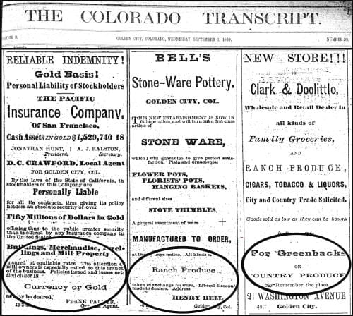 The September 1, 1869 Colorado Transcript includes several examples of “trade.” The Pacific Insurance Company accepted “Currency or Gold.” Bell’s Stone-Ware Pottery exchanged pottery for “Ranch Produce.” Clark & Doolittle took either “Greenbacks or Country Produce.”