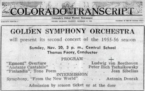 The Symphony performed in the auditorium at the Central School (later Mitchell Elementary) until the “new” Golden High School was built in the mid-1950s. They used the high school’s auditorium until the Green Center was built on the School of Mines Campus in 1972. The 1400-seat Bunker Auditorium in the Green Center has been their home for the past 40 years. In addition to the indoor concerts at the Green Center, the Symphony often does summer concerts in Jefferson County parks–including the August concert in Parfet Park.