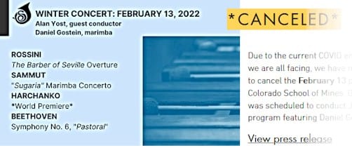 Due to the current COVID environment and challenges we are all facing, we have made the difficult decision to cancel the February 13 performance at the Colorado School of Mines. Guest conductor Alan Yost was scheduled to conduct Jefferson Symphony in a program featuring Daniel Gostein, marimba. View press release