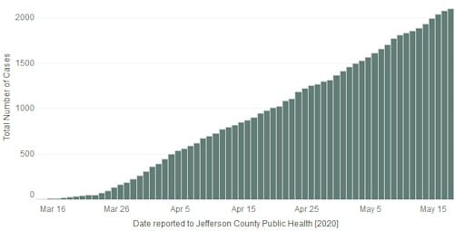 Jefferson County’s case count page says that as of 3PM yesterday, there have been 2,120 cases in Jefferson County (up from 2,098). There have been 128 deaths (up from 127) and 327 are hospitalized (up from 326). There are 172 known cases in Golden (up from 170).