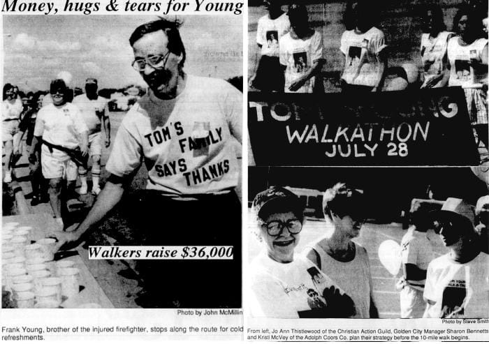 Tom’s friends from Foss Drug, the Golden Transcript, Coors, and Mayor Marv Kay organized a 10-mile walk-a-thon to raise money for the fund. The walk, with 239 participants, began in Golden and ended at St. Anthony Hospital. Tom’s 82 year-old kindergarten teacher–Verna Katona–participated. Firefighters came from all over the state to join the walk.