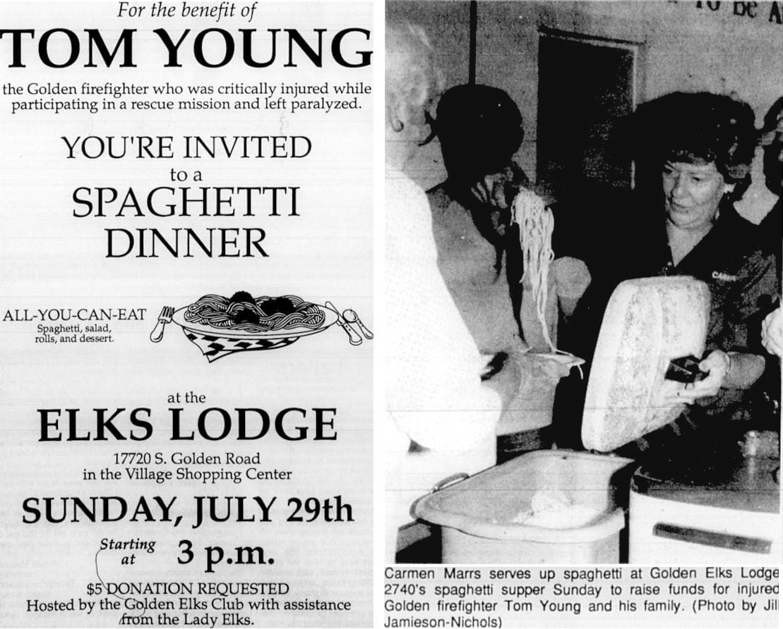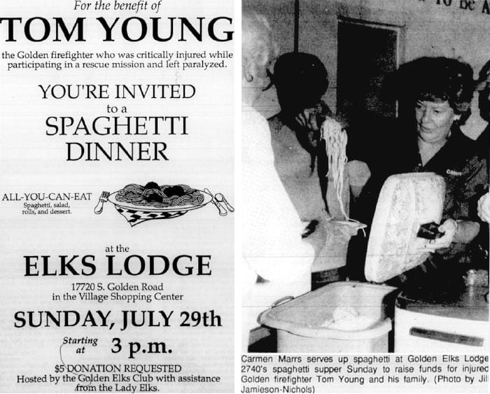 Fund-raising events abounded. The Fire Department dedicated the proceeds of the annual Buffalo Bill Days pancake breakfast to the Tom Young Fund. They served over 2000 people and raised $11,000 for the fund. Hacky sack player Ted Martin raised $2000 by attempting to break a world record. The Golden Elks Club hosted a fund-raising spaghetti dinner. Foss Drug held a bake sale. Heritage Square Music Hall gave a benefit performance and St. Joseph’s Catholic Church served a benefit breakfast. Golden Oldies held a pig roast. Golden Jaycees hosted a pool tournament. The Elks organized a square dance. The Grizzly Rose hosted a benefit concert.