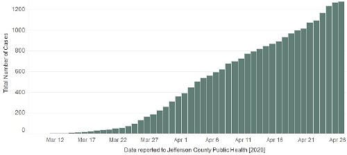 Jefferson County’s case count page says that as of 3:30PM yesterday, there were 1,278 cases in Jefferson County (up from 1,263). There have been 63 deaths (up from 61) and 270 are hospitalized (up from 268). There are 100 known cases in Golden (up from 98).