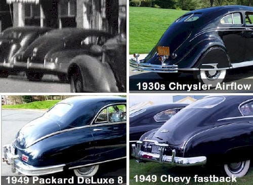 Most of the cars in the picture are pre-war, which makes sense because automobiles weren’t produced during the war. There is one slant-back car that looks post-war…possibly a 1949 Chevy Fastback or a 1948 Packard DeLuxe 8. On the other hand, it could be a Chrysler Airflow from the 1930s. Basically, the photo is too fuzzy to be entirely sure about the age of the cars.