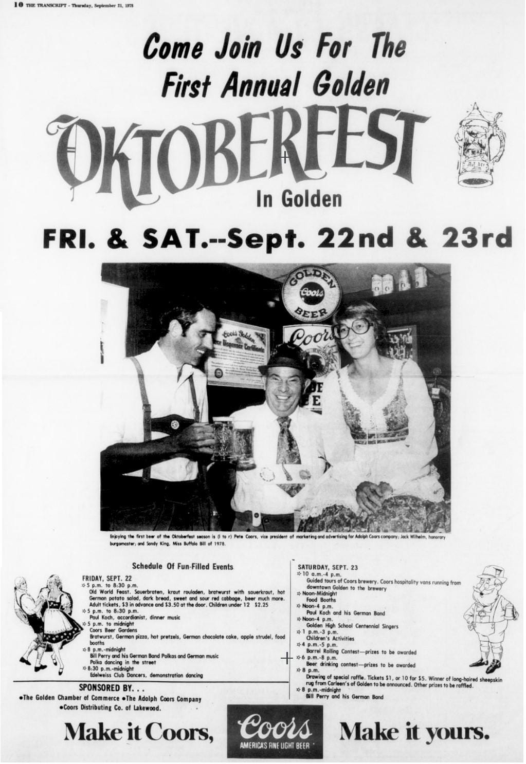 44 Years Ago, the Golden community was getting ready for an untested new event: Oktoberfest. Golden had a big German population, and then—as now—was always ready to drink beer. The event was conceived as a fund-raiser for the Golden Chamber. It was held indoors, in the vacant Hested’s department store and was planned for Friday night and all day Saturday.