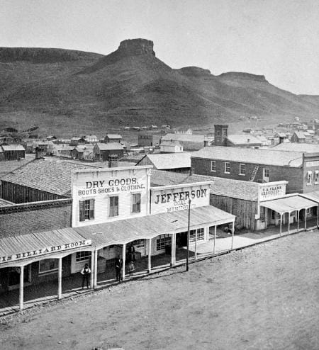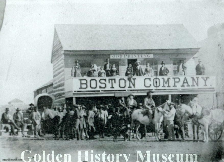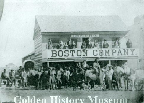 The Boston Company building (lower-left) was constructed at 10th & Washington in the summer of 1859. The Boston Company, led by George West, arrived with a wagon train of goods. As many gold-seekers were stopping at this point before making the final climb into the mountains, the Boston group decided this would be a good site for a town. They began constructing their building and hired a surveyor to lay out a town site. The building was demolished in 1926, to make room for Parfet Park.