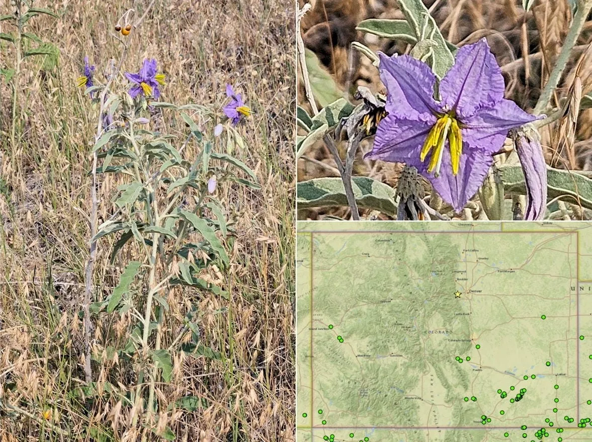 Last summer, the Weedbusters working at DeLong Park noticed a new plant. Its silvery leaves were interesting, but we had to wait until the plant bloomed to identify it. When flowers opened, their folded-back purplish petals and bright yellow anthers clearly showed it to be a nightshade. While there were several nightshades in Golden, some native and some non-native, this one was different. Eventually, we determined it to be the “Silverleaf Nightshade” — Solanum elaeagnifolium Cav.