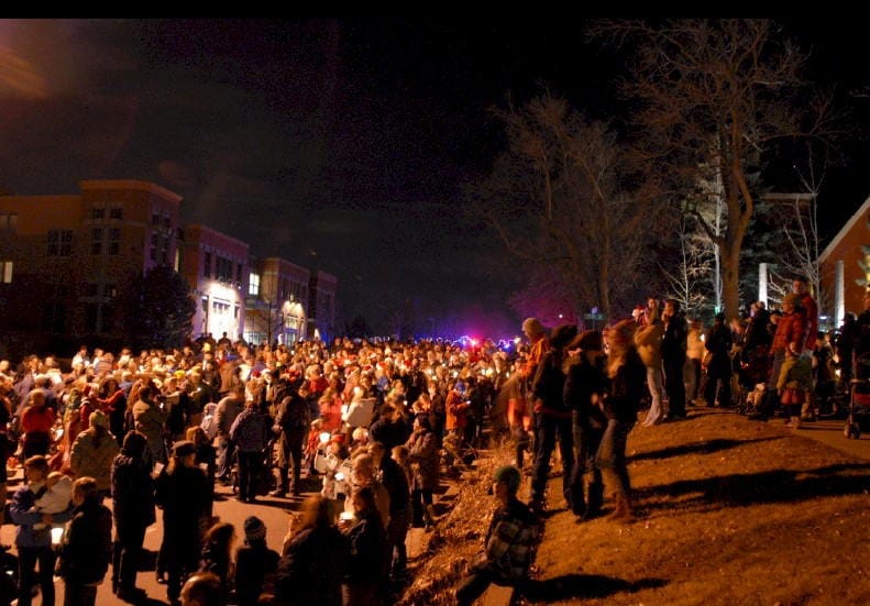 In recent years, tens of thousands of people have participated. They still meet at 15th and Washington, near Foothills Art Center. Led by Santa Claus and his wife, the group walks slowly down the hill, holding candles and singing Christmas carols. As they reach each of the cross streets, the lights along that block are turned on. When they reach the Visitors Center, there are music and dance performances, followed by the grand lighting moment. The large evergreen at 10th and Washington is turned on, with its thousands of multicolored lights. At the same time, the lights along the creek and the trees in Parfet Park come on.
