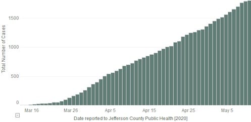 Jefferson County’s case count page says that as of 3PM yesterday, there were 1,832 cases in Jefferson County (up from 1,805). There have been 96 deaths (up from 94) and 314 are hospitalized (up from 313). There are 152 known cases in Golden (up from 147).