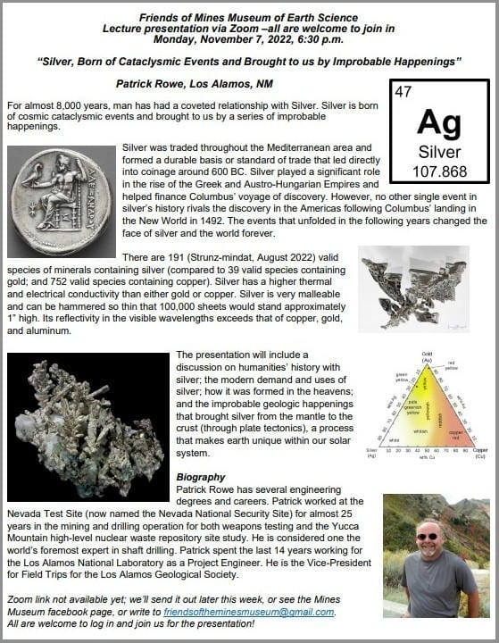 6:30PM Friends of Mines Museum Lecture: “Silver, Born of Cataclysmic Events and Brought to us by Improbable Happenings” – Patrick Rowe, Los Alamos, NM