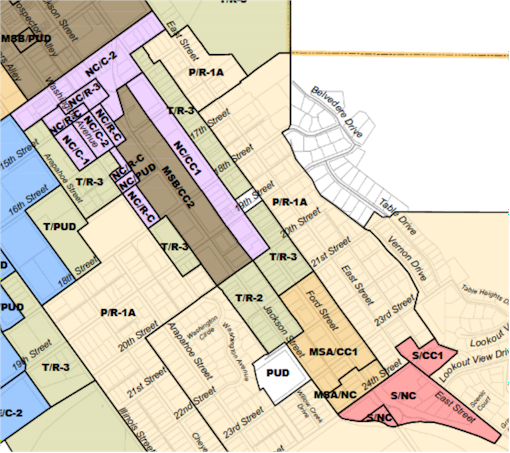 Similarly, the video says that the area from 21st – 24th, Ford to Jackson now has larger developments (showing a picture of the Jefferson County Housing Authority project), so the City will be promoting “downtown” forms in that area, with 2-3 story buildings.