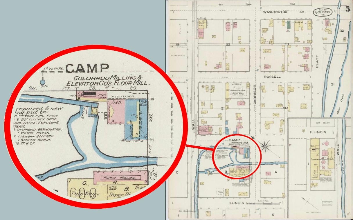 The Rock Flour Mill was powered by a mill race–a channel of water diverted from Clear Creek. The mill race also powered the Golden Paper Mill, which was located just west of the Flour Mill.